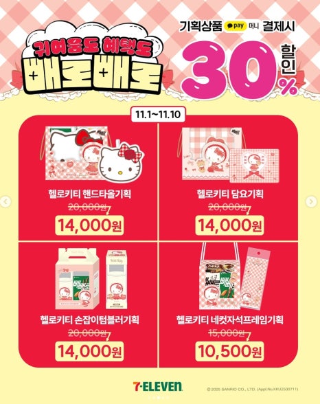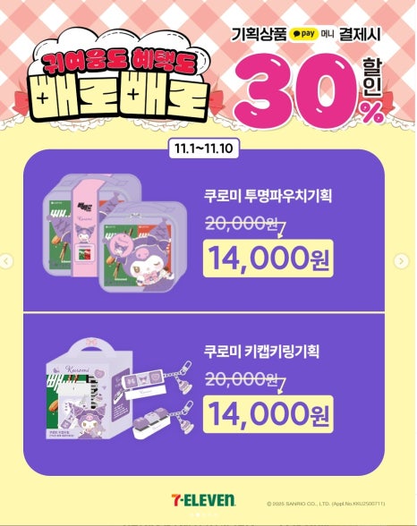 이번 2025년 세븐일레븐 빼빼로데이는 “귀여움 × 혜택 × 수량” 세 박자가 완벽하게 맞아떨어졌어요. 귀여움은 산리오 & 테디베어 굿즈, 혜택은 카카오페이 30% + 카드 2+2, 수량은 116종이라는 압도적인 라인업까지. 빼빼로데이가 이렇게나 다채롭고 치명적인 이벤트였나 싶습니다. 선물용으로도 좋지만, 솔직히 이번엔 나를 위한 선물로 사도 괜찮잖아요? 책상 위에 쿠로미 키링 하나 달아두면, 오늘도 조금 더 귀엽게 버틸 수 있으니까요. 여러분도 행복한 빼빼로데이 보내세요!