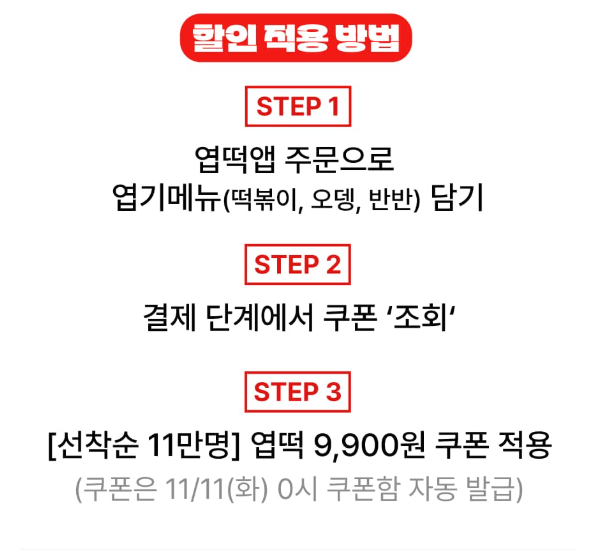 11월 11일 0시부터 앱 '쿠폰함'에 4,100원 할인 쿠폰이 자동으로 발급됩니다. 결제 시 이 쿠폰을 적용하면 9,900원에 엽떡을 맛볼 수 있어요!