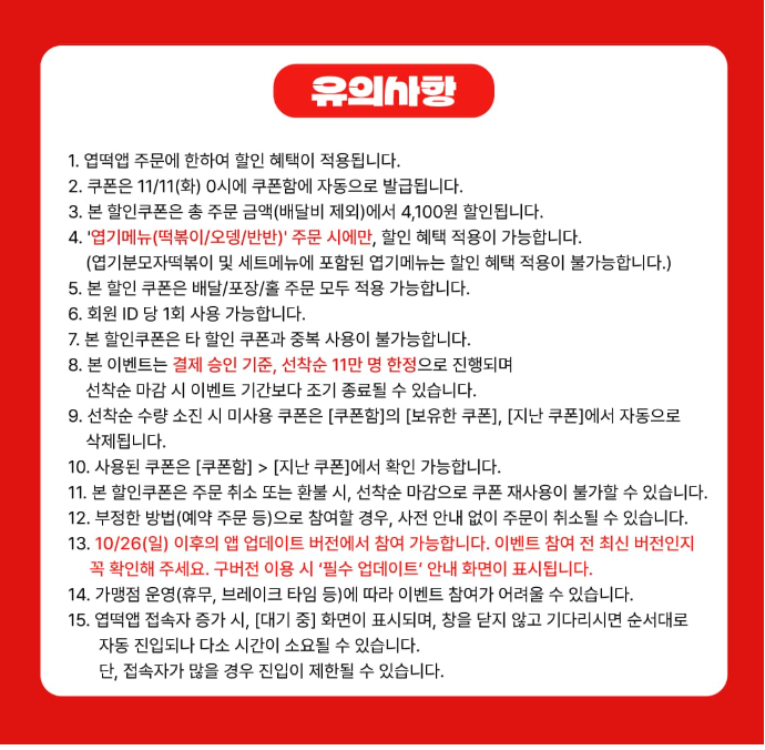 아무리 좋은 할인 혜택도 제대로 알고 이용해야겠죠? 소중한 엽떡을 놓치지 않기 위해 꼭 알아두어야 할 주의사항들을 정리해 봤습니다. 이 내용을 반드시 숙지하고 엽떡데이를 100% 즐겨보세요!