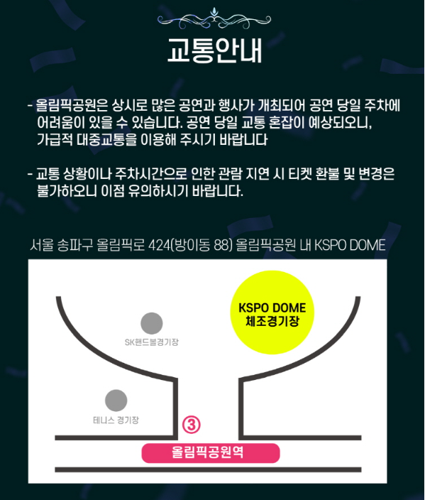 올림픽공원 KSPO DOME (서울 송파구 올림픽로 424)은 상시로 많은 행사가 개최되어 공연 당일 주차에 어려움이 있을 수 있습니다. 쾌적한 관람을 위해 대중교통 이용을 적극 권장 드려요!