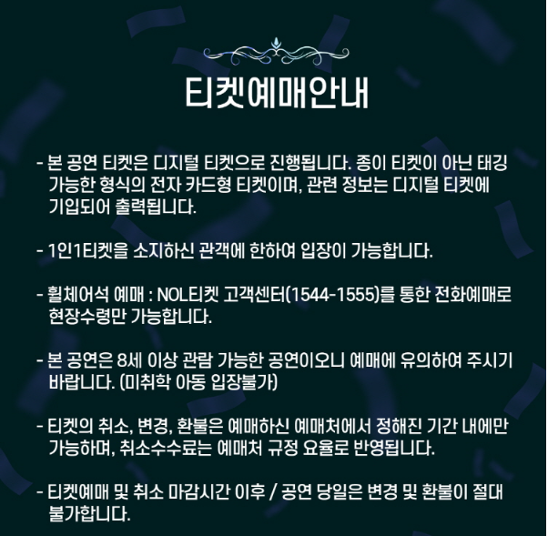 - 미수령 티켓: 배송된 티켓을 공연일 기준 일주일 전까지 수령하지 못했다면 NOLEI티켓 고객센터(1544-1555)로 반드시 사전 문의해야 합니다. 고객 부재로 반송된 티켓은 현장 매표소에서 수령해야 합니다.