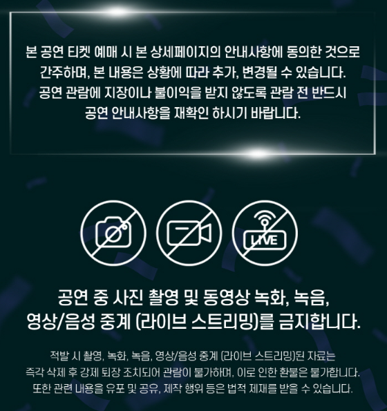 - 촬영/녹음 금지: 공연 중 사진 및 동영상 촬영, 녹음 등은 저작권 침해 및 아티스트 퍼블리시티권 침해에 해당하는 불법행위입니다. 적발 시 촬영 기기 데이터 압수 및 즉시 퇴장 조치되며, 촬영 기기 파손/분실은 책임지지 않습니다.