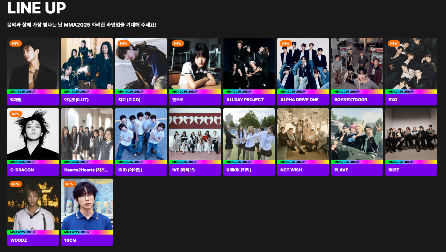 마지막으로 공개된 4차 라인업에서는 K-POP의 폭넓은 스펙트럼을 보여줄 레전드 아티스트들과 뜨겁게 떠오르는 신인들이 한자리에 모였습니다. 이들의 조합은 MMA2025를 더욱 특별하게 만들 거예요.